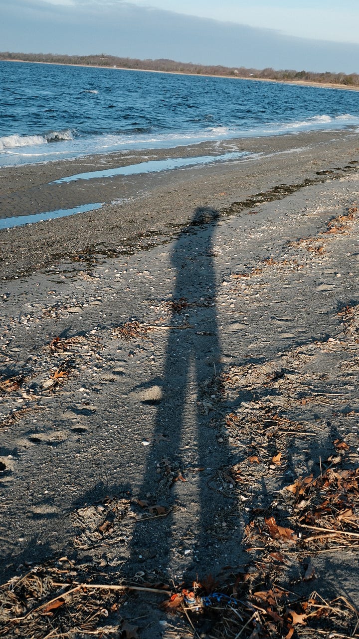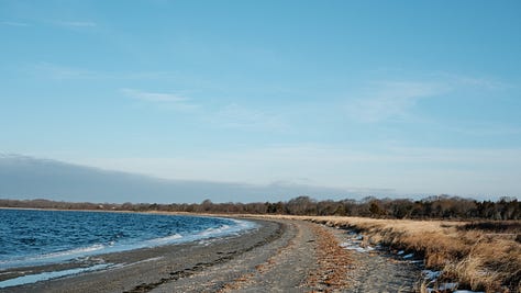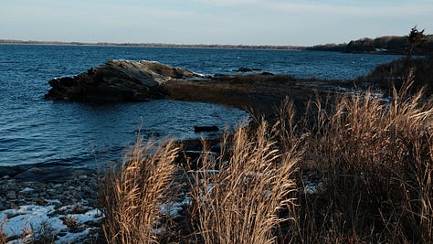 When I woke the next morning on Prudence, the sun was out and it stayed below freezing for a few hours. I made coffee and drove to the west side by the old stone dock and felt the wind on my face. Then I parked at Picnic Tree Beach where two ducks and a seagull floated in the gentle bay waves just beyond the marsh grass and where the golden morning sunlight reached over the island making long winter shadows cast by the scraggy windswept trees.